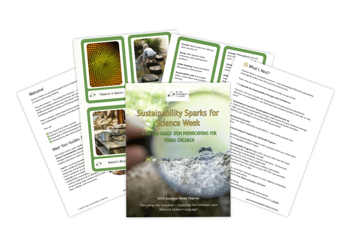 ✨ Together, these sparks offer more than just activity ideas — they provide a powerful framework for meaningful learning. These practical tools elevate everyday play into rich learning experiences that support STEM exploration and sustainability thinking. It’s a simple, impactful way to meet children where they are, while building your team’s confidence and capability in integrated, inquiry-based education.